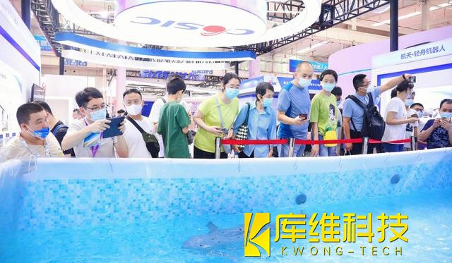 作為為數不多的可以“游泳”的機器人,中國航天科工三院展臺上由沈陽航天新光集團研發的江豚機器人吸引了很多觀眾的目光。展臺工作人員向記者介紹,該型機器人采用了長江江豚的原始灰色配色,按照長江江豚的運動仿生學,可實現近似長江江豚的游動模式,如上浮、下潛、滾轉、倒退等水中動作,也可預設游動軌跡,實現水中游動表演,具有較高的機動性,“目前此類產品已經接到了不少海洋公園的訂單,而且在探測水質等領域此類機器人也有著很大潛力,因為相比類似潛艇的螺旋槳驅動,仿生運動技術不要求很高的轉速,更加節約能源。”