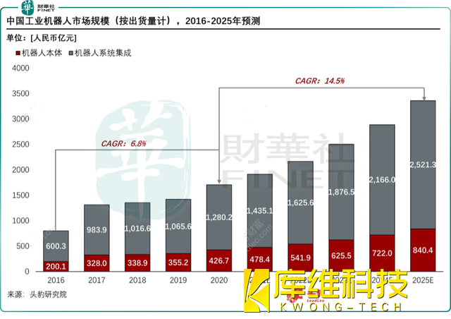 工業(yè)機器人是我國智能制造2025的核心抓手之一,是我國機器換人、制造業(yè)產(chǎn)業(yè)升級的核心環(huán)節(jié)。目前看,我國制造業(yè)三化仍處于初級階段,我國工業(yè)機器人中長期看仍具有較大的增長空間。據(jù)頭豹研究院預(yù)測,到2025年,中國工業(yè)機器人行業(yè)市場規(guī)模將達到3361.7億元,未來五年的年復(fù)合增長率約為14.5%。