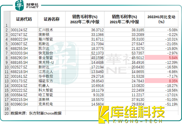 而由于原材料成本上漲,今年上半年各主要工業(yè)機器人廠商的毛利率普遍同比下降,只有兩家企業(yè)的毛利率同比上升。