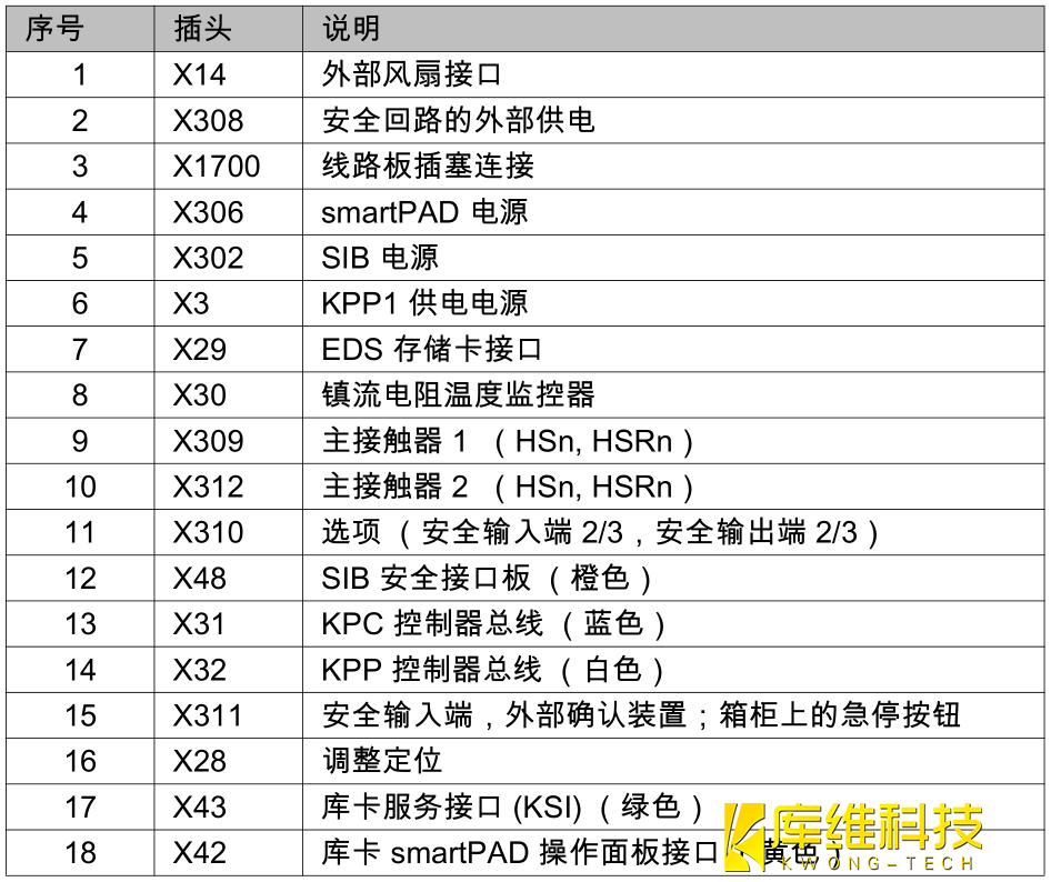 控制柜 (CCU)包含兩塊電路板 (CIB 控制柜接口板和 PMB 電源管理板),是機器人控制系統所有組件的配電裝置和通訊接口. 所有數據通過內部通訊傳輸給控制系統,并在那里繼續處理. 當電源斷電時,控制系統部件接受蓄電池供電,直至位置數據備份完成以及控制系統關閉. 通過負載測試檢查蓄電池的充電狀態和質量.