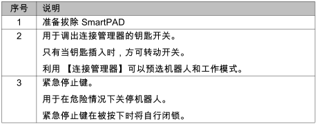 如果工業(yè)機(jī)器人 smartPAD 已拔出,則無法再通過 smartPAD 上的緊急停止按鍵來使設(shè)備停機(jī)。 因此必須在機(jī)器人控制系統(tǒng)上外接一個(gè)緊急停止裝置。運(yùn)營商應(yīng)負(fù)責(zé)將已拔出的 smartPAD 立即從設(shè)備中撤離并將其妥善保管。保管處應(yīng)遠(yuǎn)離在工業(yè)機(jī)器人處作業(yè)的工作人員的目視和作用范圍。 其中目的是為了防止有效的和無效的緊急停止裝置被混淆。如果沒有注意該措施, 則有可能造成人員嚴(yán)重身體傷害乃至致命或者巨大的財(cái)產(chǎn)損失。