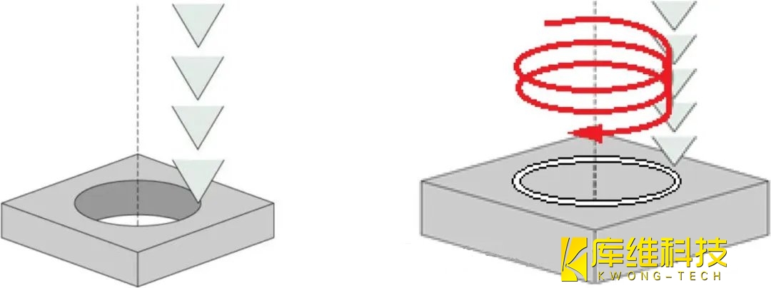 2、水導激光打孔角孔時,孔前緣僅在打孔開始時經歷高溫。隨著鉆孔向下移動(以螺旋方式),高溫區域已完全包含在激光照射區域內,從而實現無分層鉆孔。這與毫秒激光鉆孔相反,在毫秒激光鉆孔中,從鉆孔過程開始到結束,在孔的前緣可以觀察到有明顯更高的溫度。