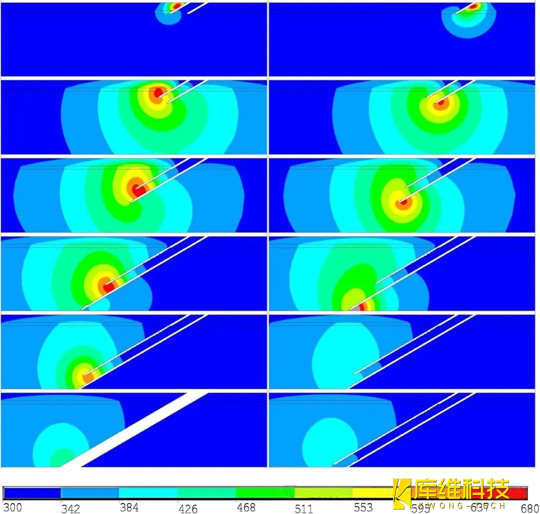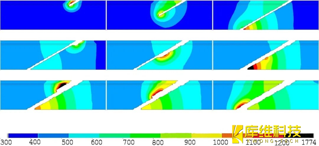 圖6和圖7分別顯示了ms和水導激光鉆孔的燒蝕曲線和溫度曲線。所有結果都被繪制為與脈沖結束時間(下一個激光脈沖與材料相互作用之前)相對應的時間。圖6中的視圖1、視圖2和視圖3分別對應了初始沖擊的結果:激光位于鉆孔圓的右側和激光位于鉆孔圓的左側。圖6的一個主要觀察結果是,在大多數情況下,在孔的頂部前緣觀察到一個高溫區,這應該是熱障涂層分層的主要原因。