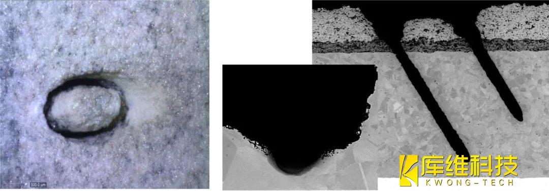 圖9、水導激光在與表面45°處部分鉆孔的光學顯微圖像